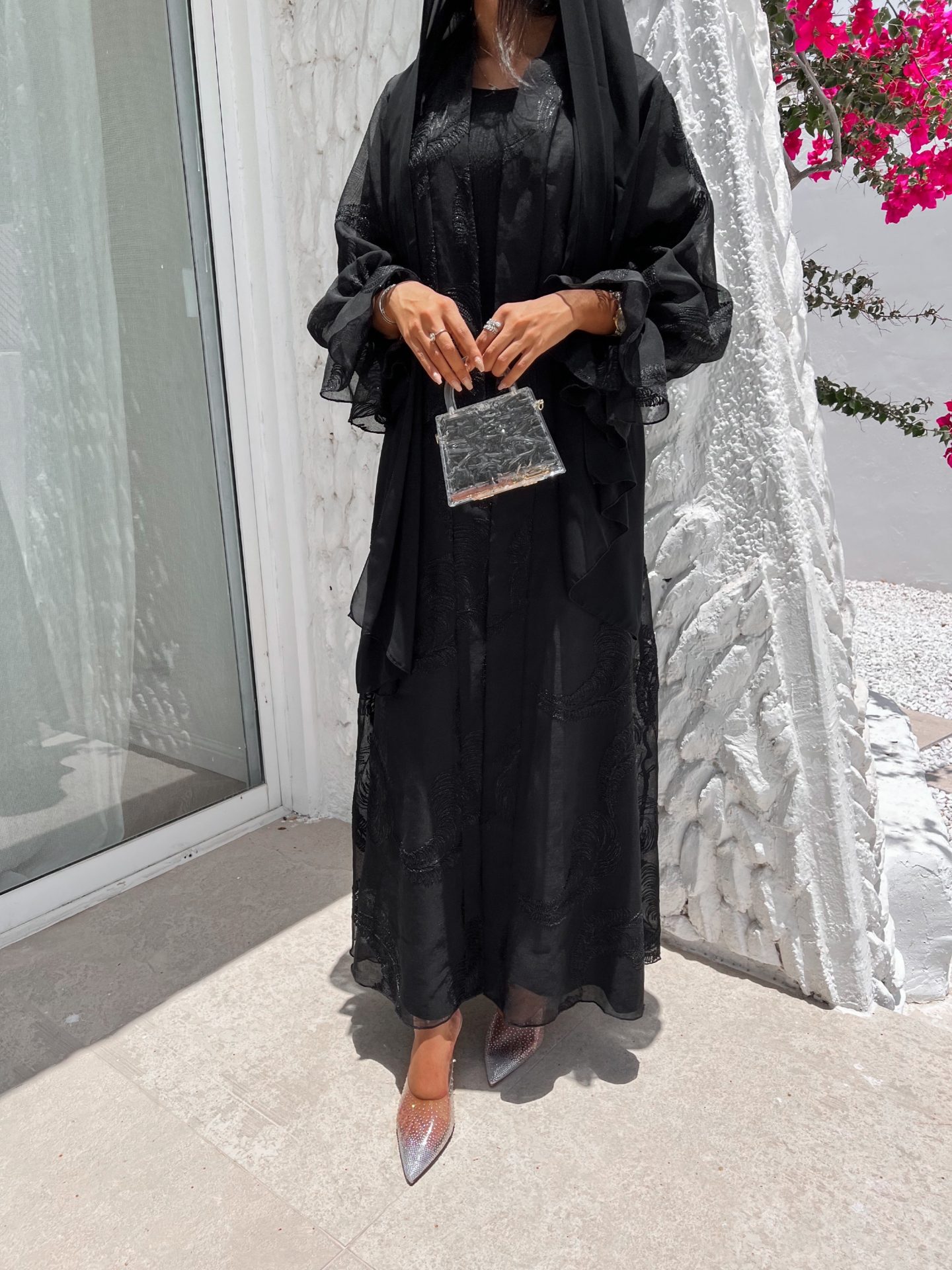 An abaya of metallic embossed Lenin.. very distinctive and elegant.. suitable for occasions and holidays or just to make you look elegant in the easiest way.. It consists of two pieces, an abaya and an inner dress of raw material, with a narrow cut and a three quarter length.
